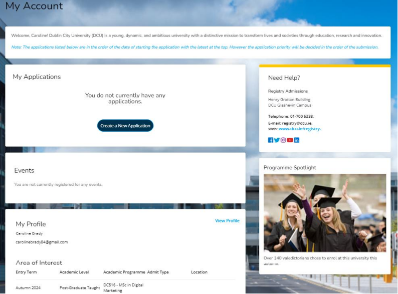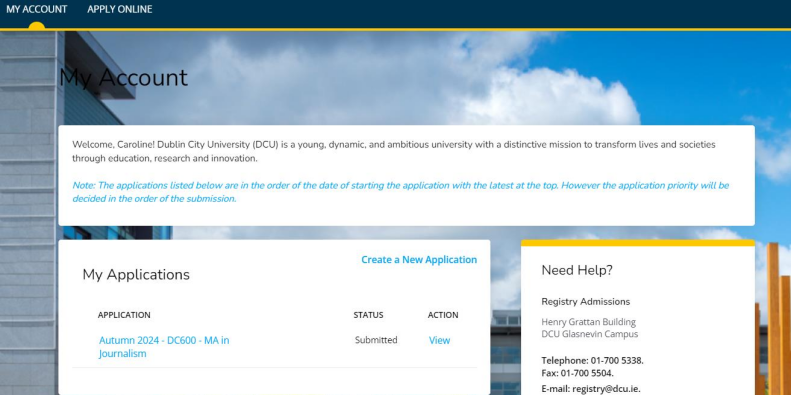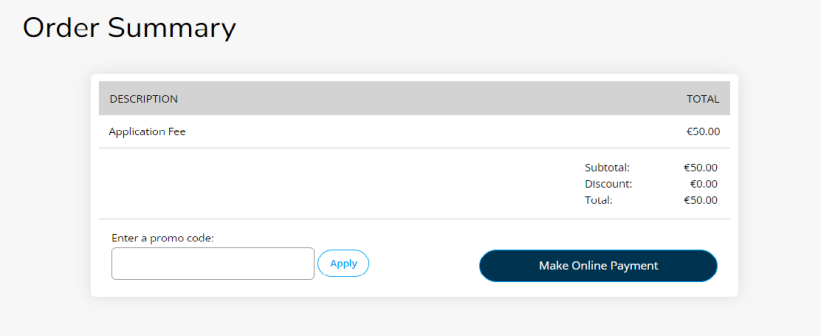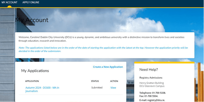 申请提交成功后会看到缴纳50欧元申请费的平台,一次申请费最多可以申请三个专业。但是DCU是按照志愿顺序依次审核,拿到第一志愿offer则不继续审核第二志愿。所以请务必在申请时排列好志愿顺序。