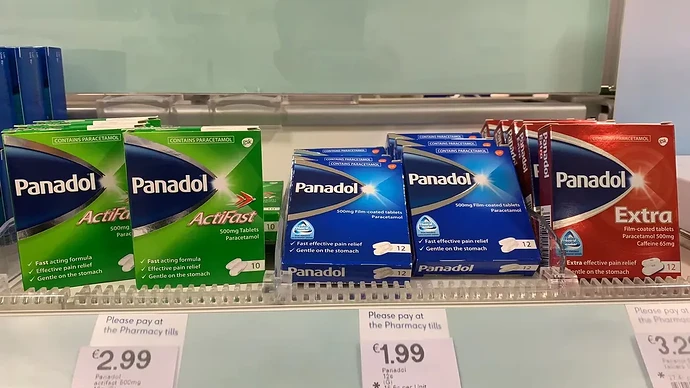 The best-selling all-purpose painkiller in Ireland is Panadol. It comes in red, green, and blue boxes, each designed for different types of pain — headaches, period pain, back pain, rheumatism, or toothaches. You can easily find it at Boots stores.
